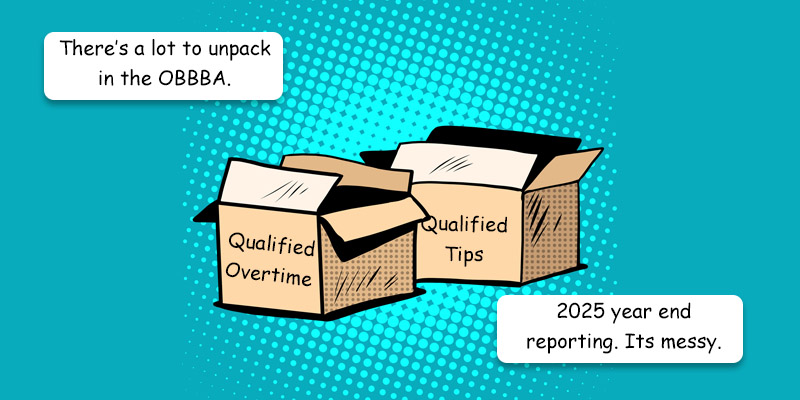 As discussed in our earlier blog post here, the One Big Beautiful Bill Act (OBBBA) allows for a provision of “no tax” on tips and overtime.  This has turned out to be a bit of a mess, as it pertains to 2025 reporting to the employees, due to insufficient time for the Social Security Administration and the IRS to make the changes to their forms to account for it.  Not to mention many payroll systems were not prepared for this brand new retroactive reporting, especially as it pertains to qualified overtime.  With that being said, 2025 will be treated as…